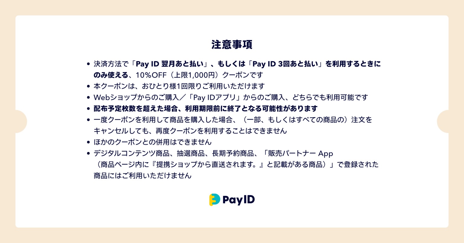•決済方法で「Pay ID 翌月あと払い」、もしくは「Pay ID 3回あと払い」を利用するときにのみ使える、**10%OFF(上限1,000円)**クーポンです。
