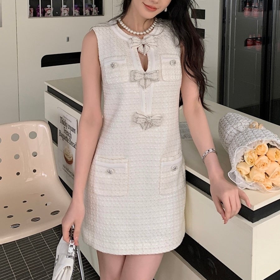 検索キーワード:ツイード ワンピース 白ドレス キャバ嬢 ビジューリボン