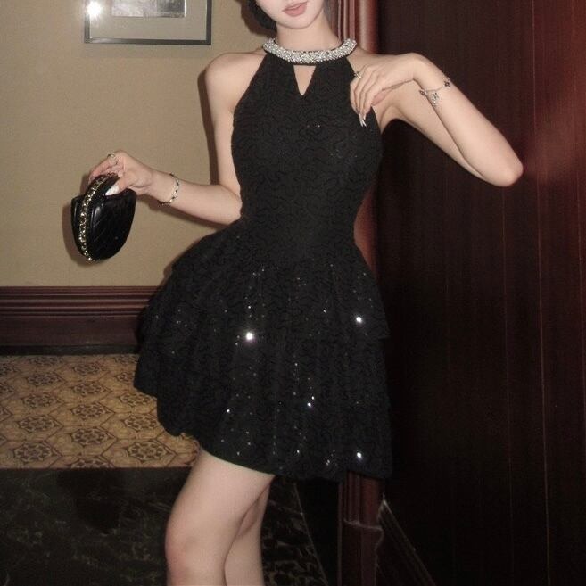 ブラックレース ワンピース / ホルターネック ワンピース / ティアードワンピース / 大人ガーリー ドレス / パーティードレス 再販 / キャバドレス
