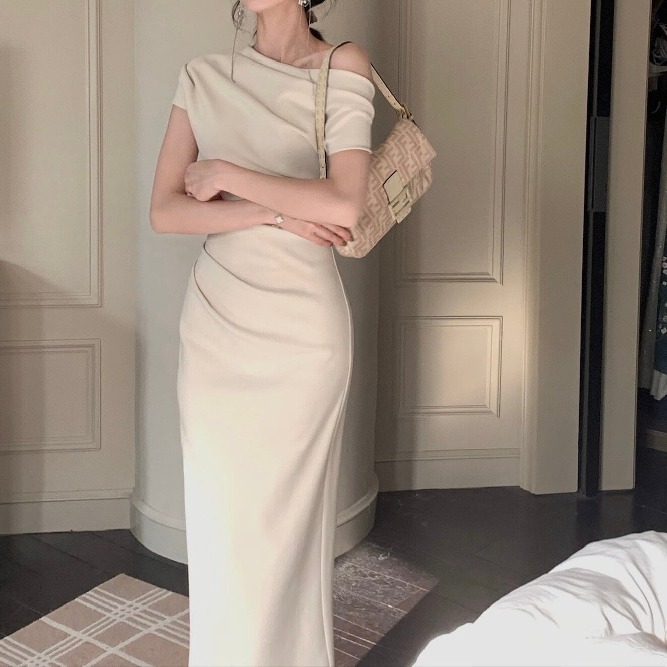 2025年トレンドの“ワンショルダー”を上品に取り入れたタイトロングドレス。