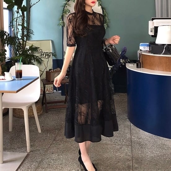 半袖レース × ミディアム丈 × ブラックフレアは、同窓会で好印象を狙いたい方の鉄板スタイル✨