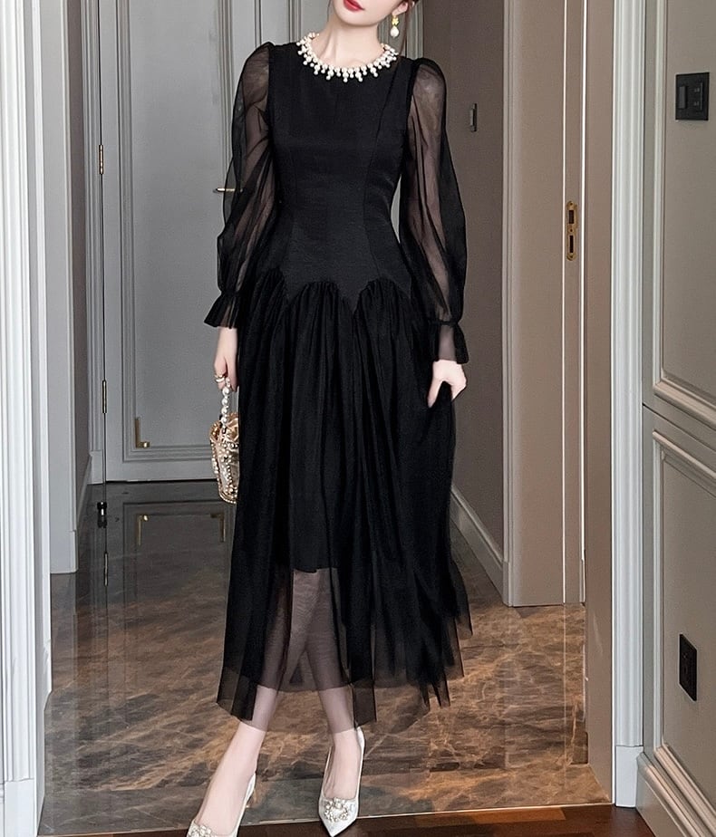 【12月下旬入荷】【一部受注】シアースリーブチュールロングワンピース