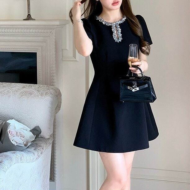 【即納】【一部受注】エレガントフレアミニワンピース《ブラック・パステルブルー》