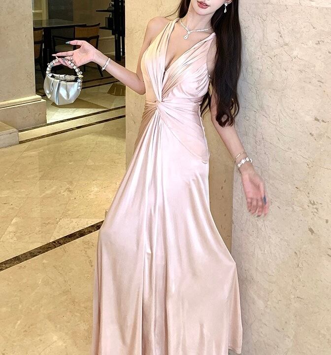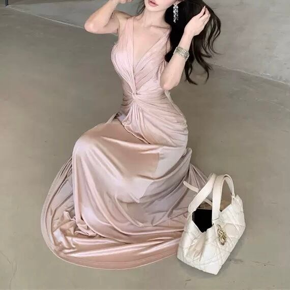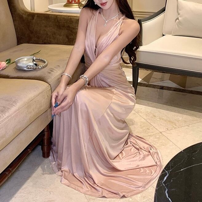 バックオープンサテンロングワンピース。