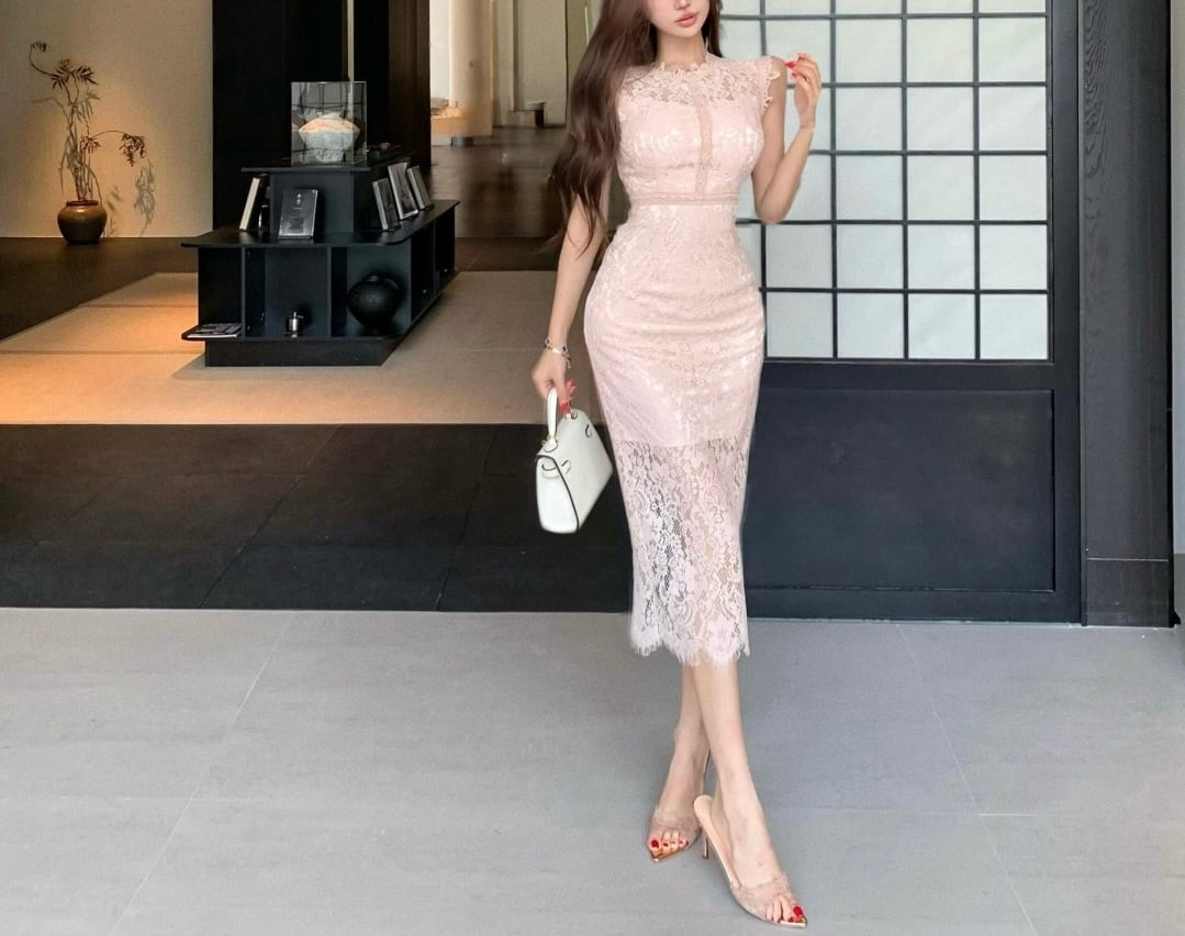 【華やかさ際立つ、フルレースシアーエレガントワンピース《ヌードピンク》】