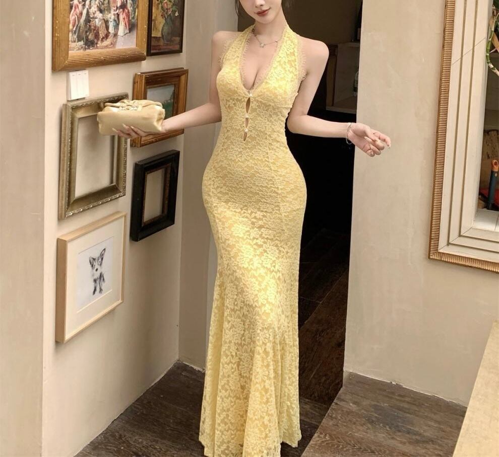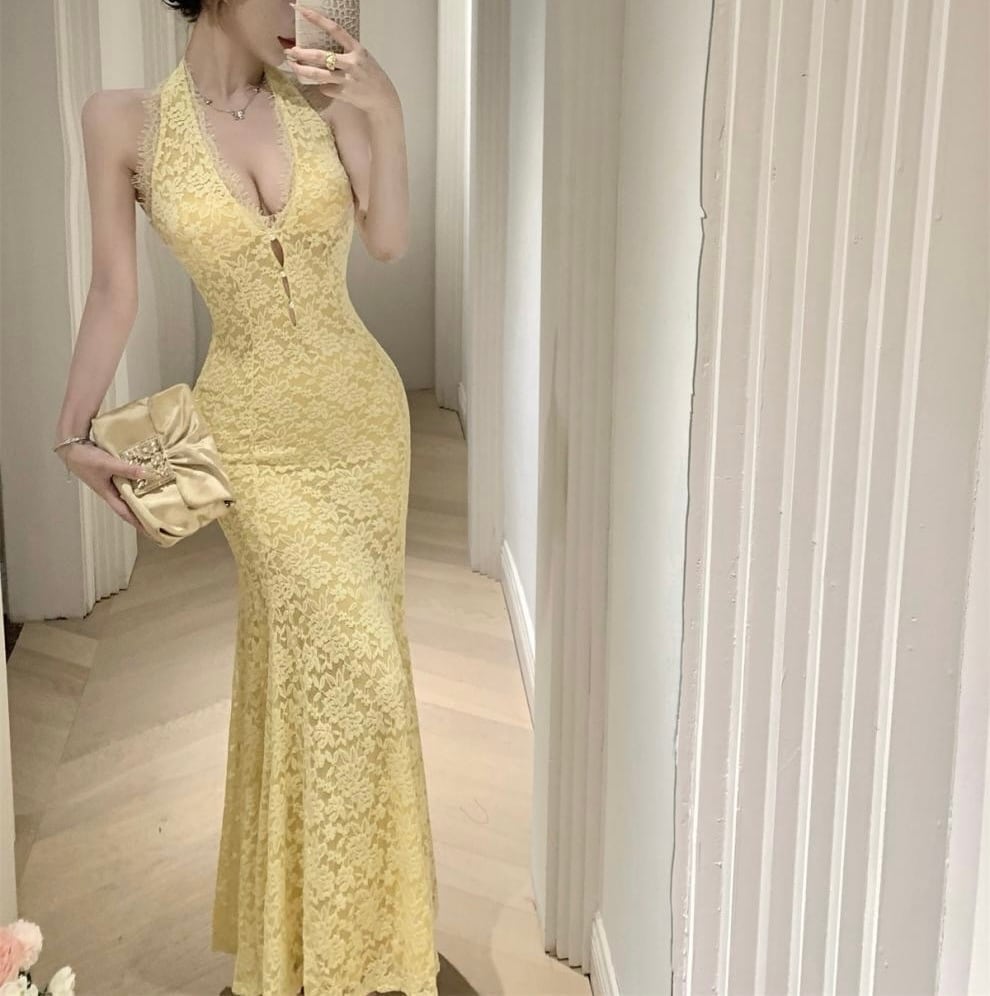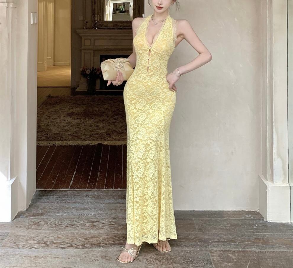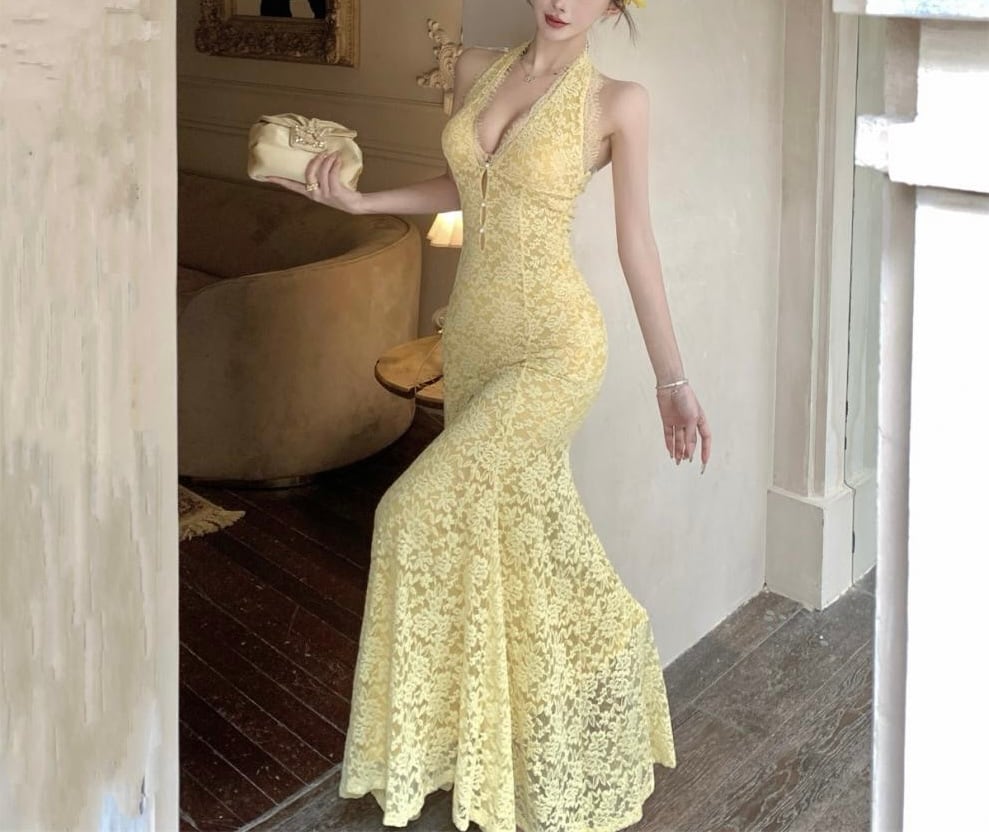 【視線を惹きつける、ホルターネックロングワンピース】