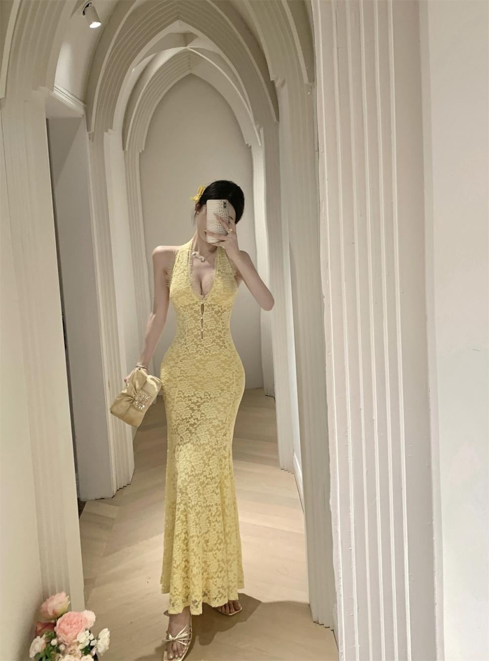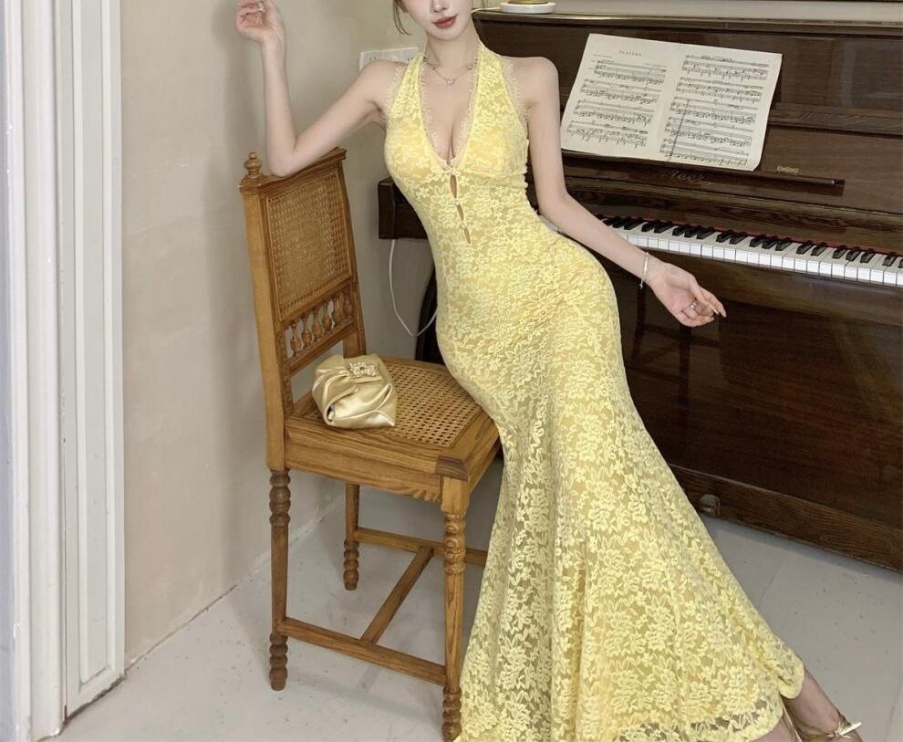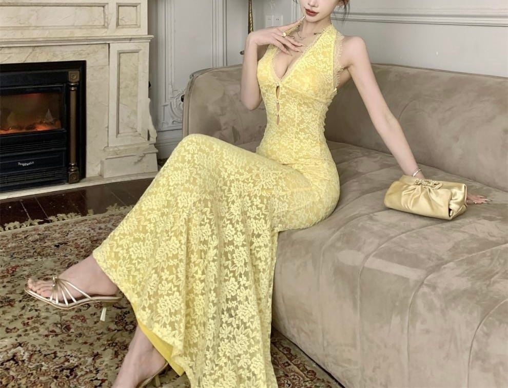 【視線を惹きつける、ホルターネックロングワンピース】