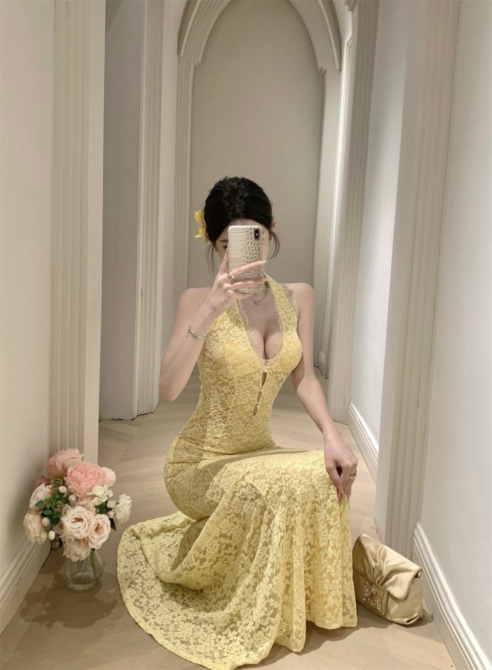 【受注】フルレースホルターネックロングワンピース