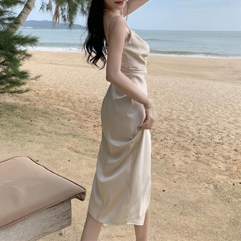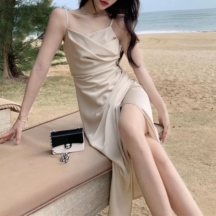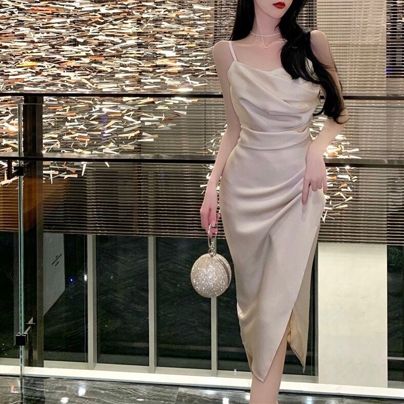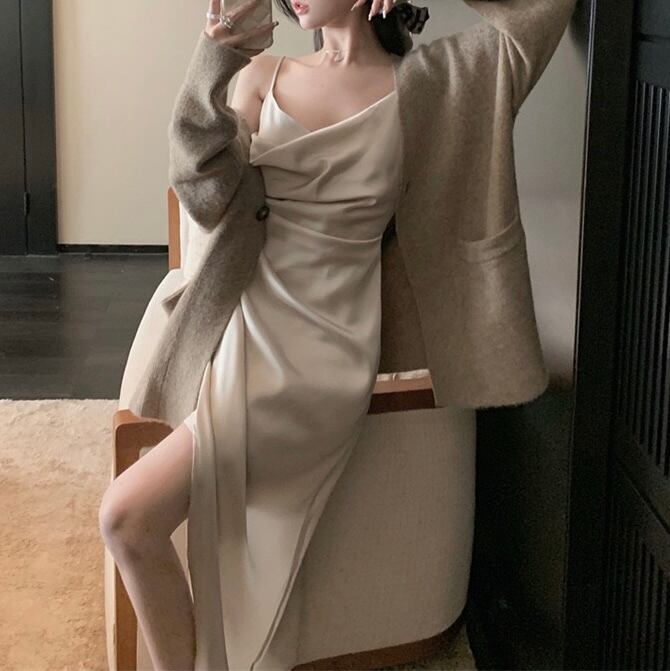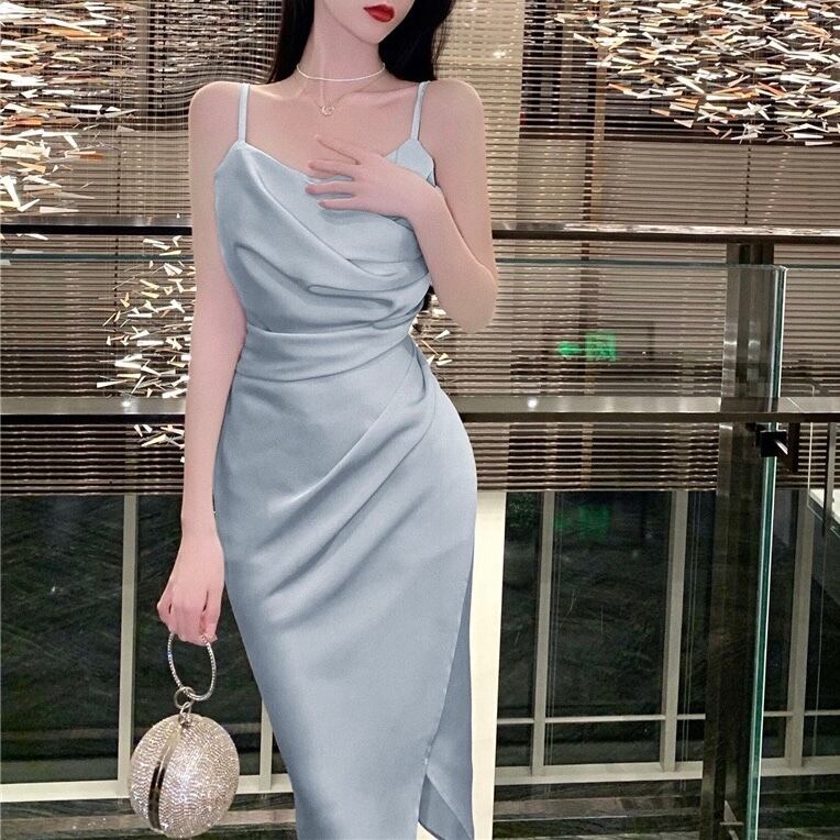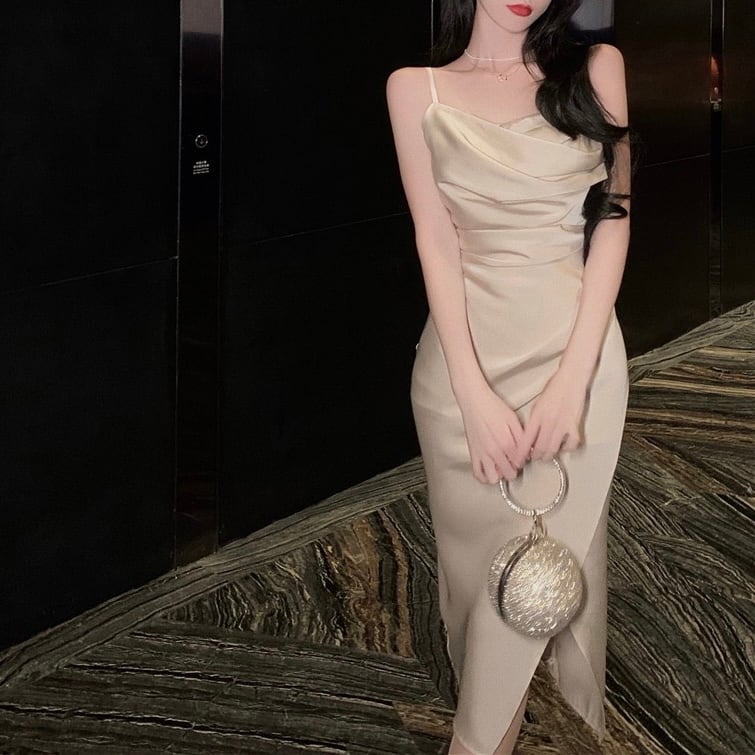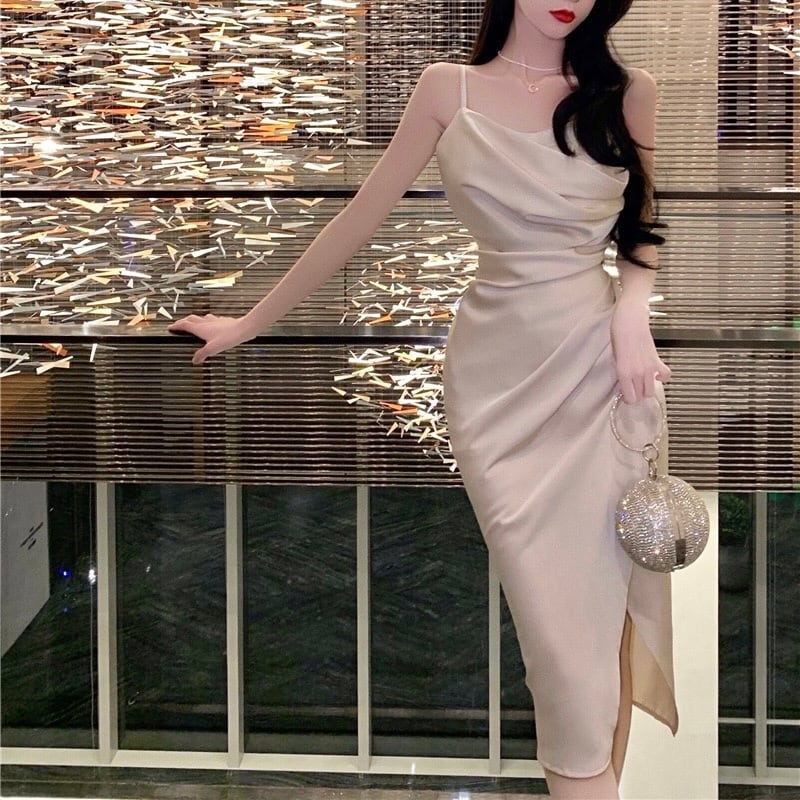 【キャミワンピ ドレス スリット 光沢 ドレープ シルク サテン パーティードレス キャバドレス 上品 エレガント】