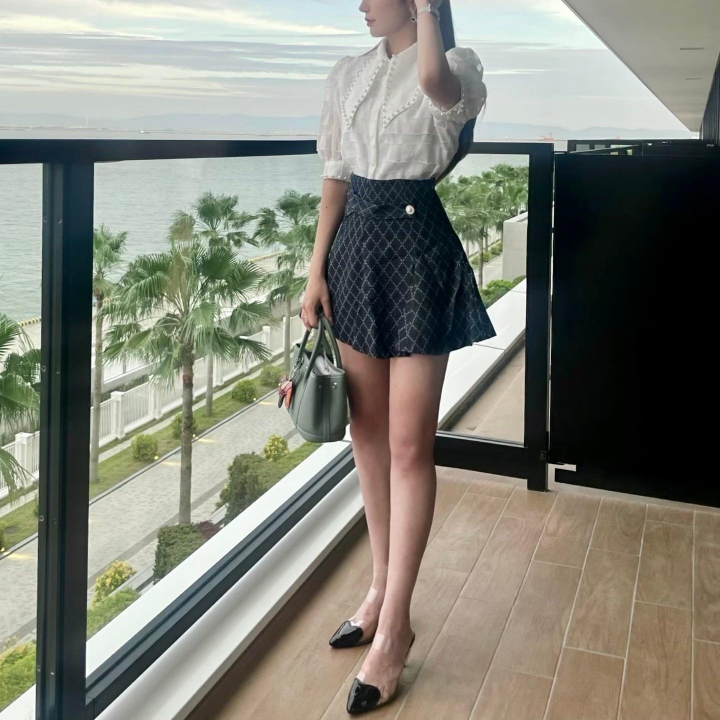 ミニ丈で、女性らしい可愛らしさを引き立てます。