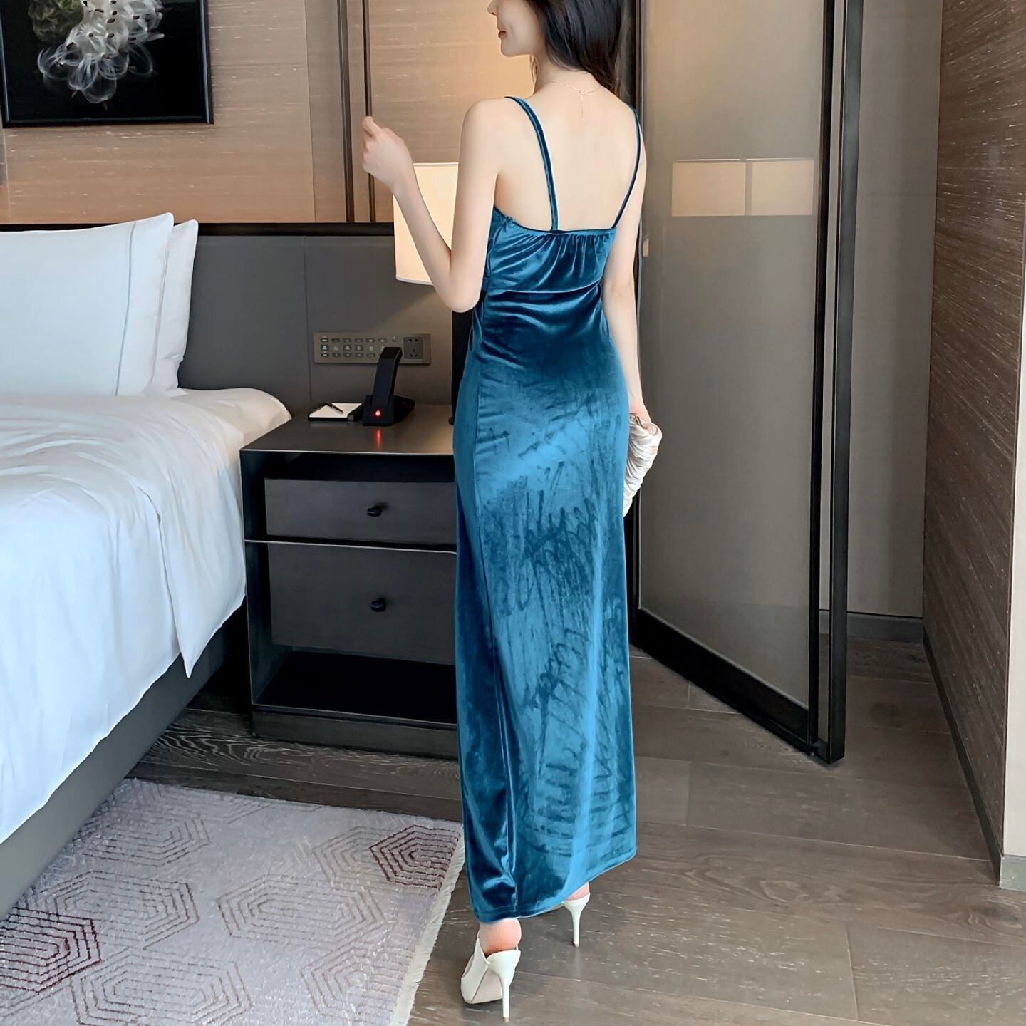 ウエストカットのデザインが腰のくびれを強調し、深いスリットが脚を綺麗に見せ