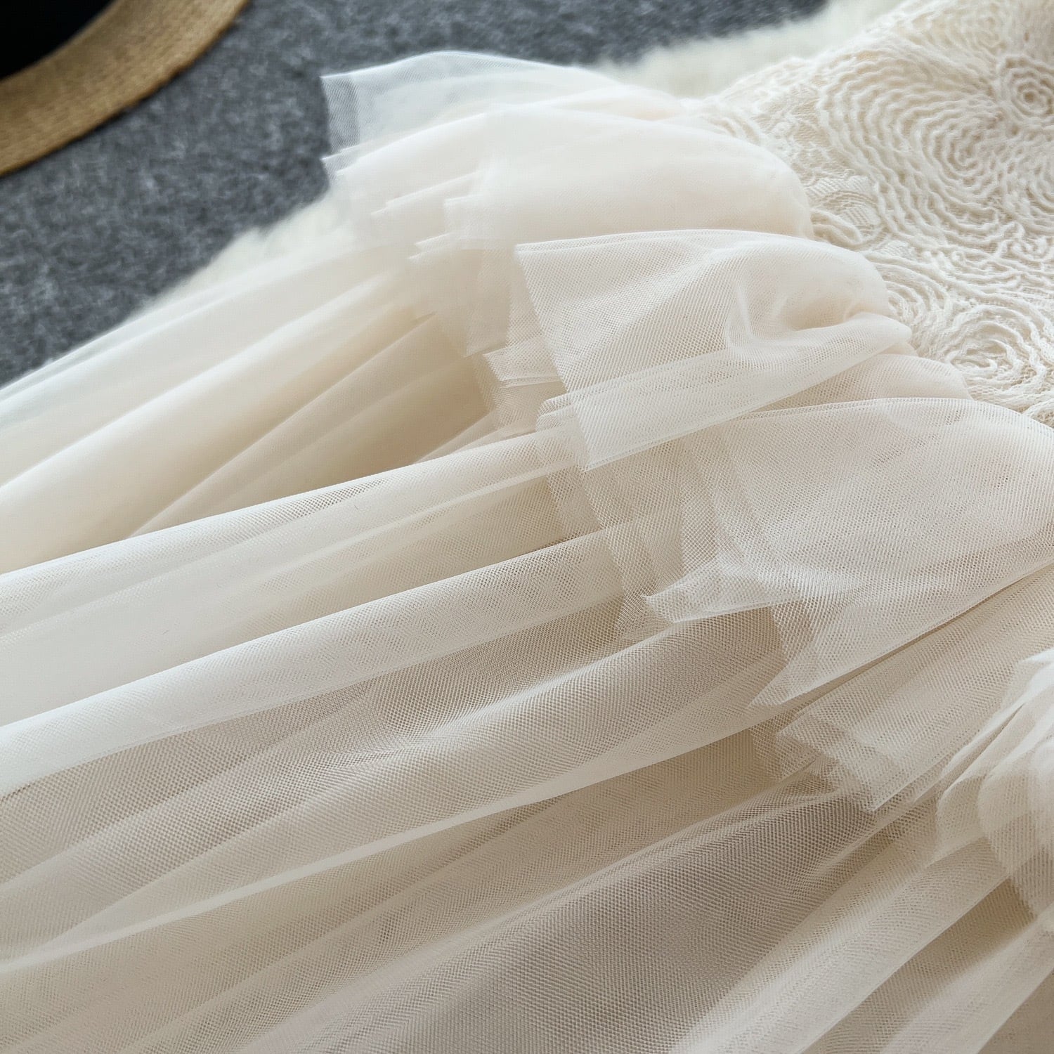 透け感のある生地が軽やかさを演出し、